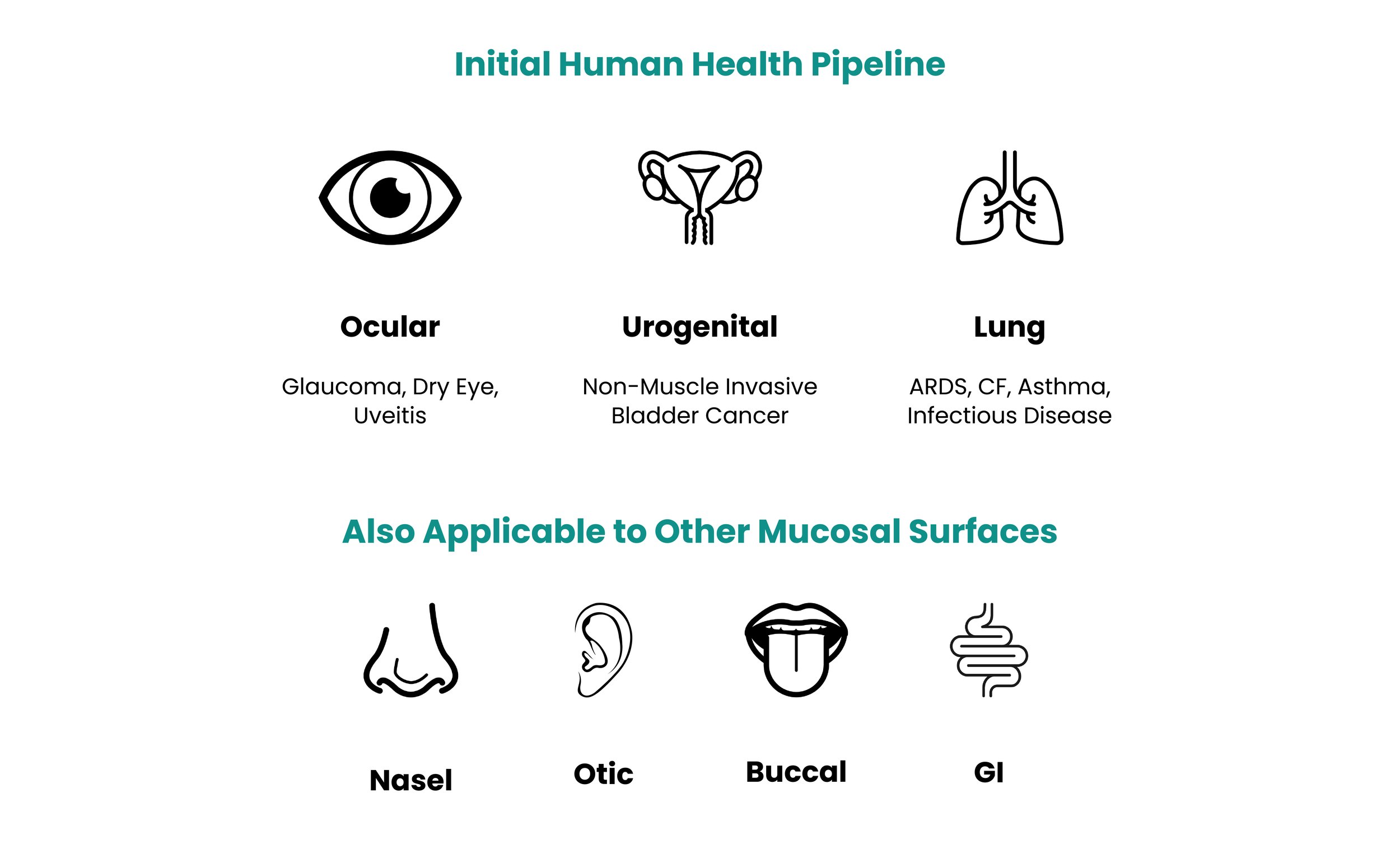 Beyond glaucoma, our platform enables delivery of anti-inflammatory, antiviral and other classes of therapeutics across all mucosal barriers for human and veterinary indications.